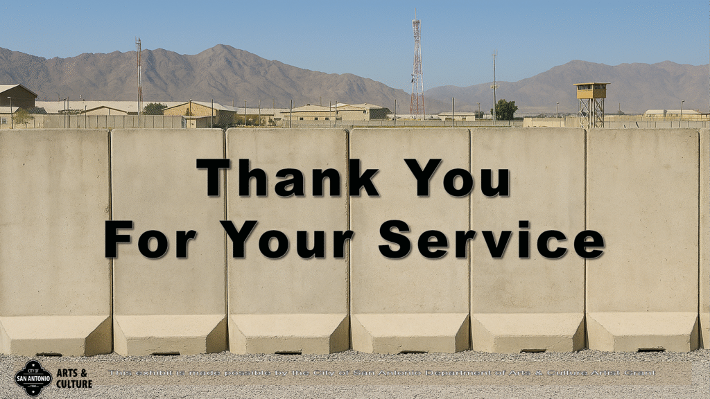 Thank You For Your Service examines the hollow ritual of gratitude that greets many veterans. The work unravels the phrase, which has been smoothed into a polite reflex, and exposes its weight, its awkwardness, and its inability to capture the reality of combat. Through video, sound, and text, the project invites viewers to inhabit the tension between public performance and private memory.